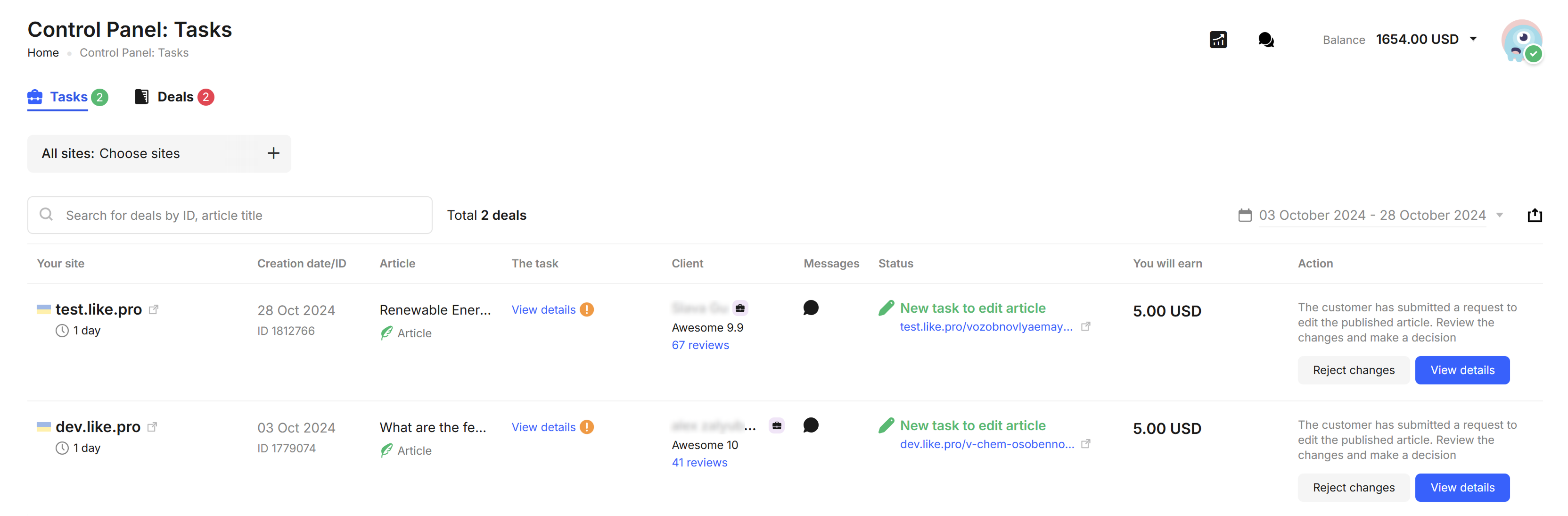 When a new edit request for a published article is submitted by the Client, you will receive a notification and a new agreement on the “Tasks” page in the control panel.