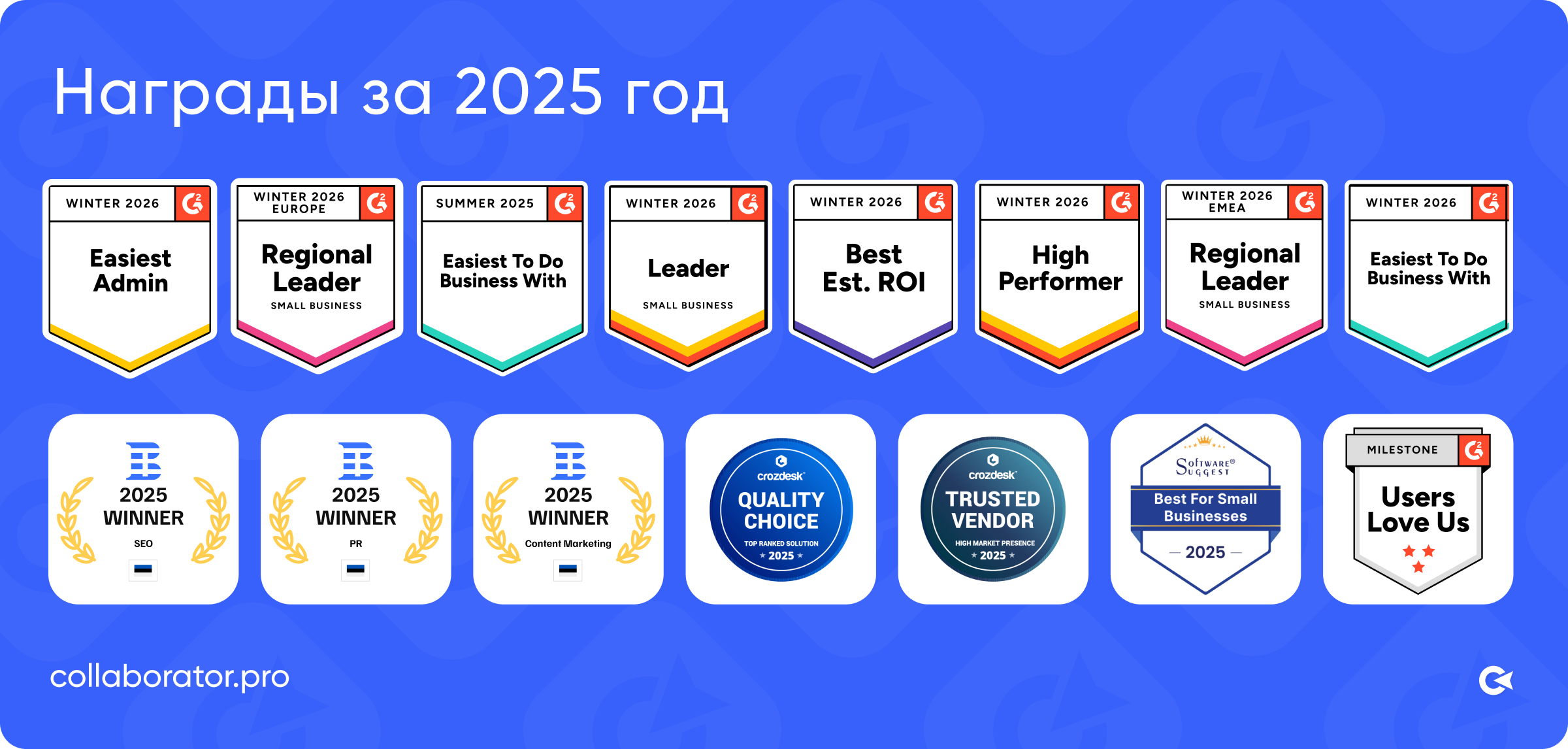 2025 год стал для Collaborator еще и годом международного признания. Мы получили новые награды от TechBehemoths, SoftwareSuggest и G2.